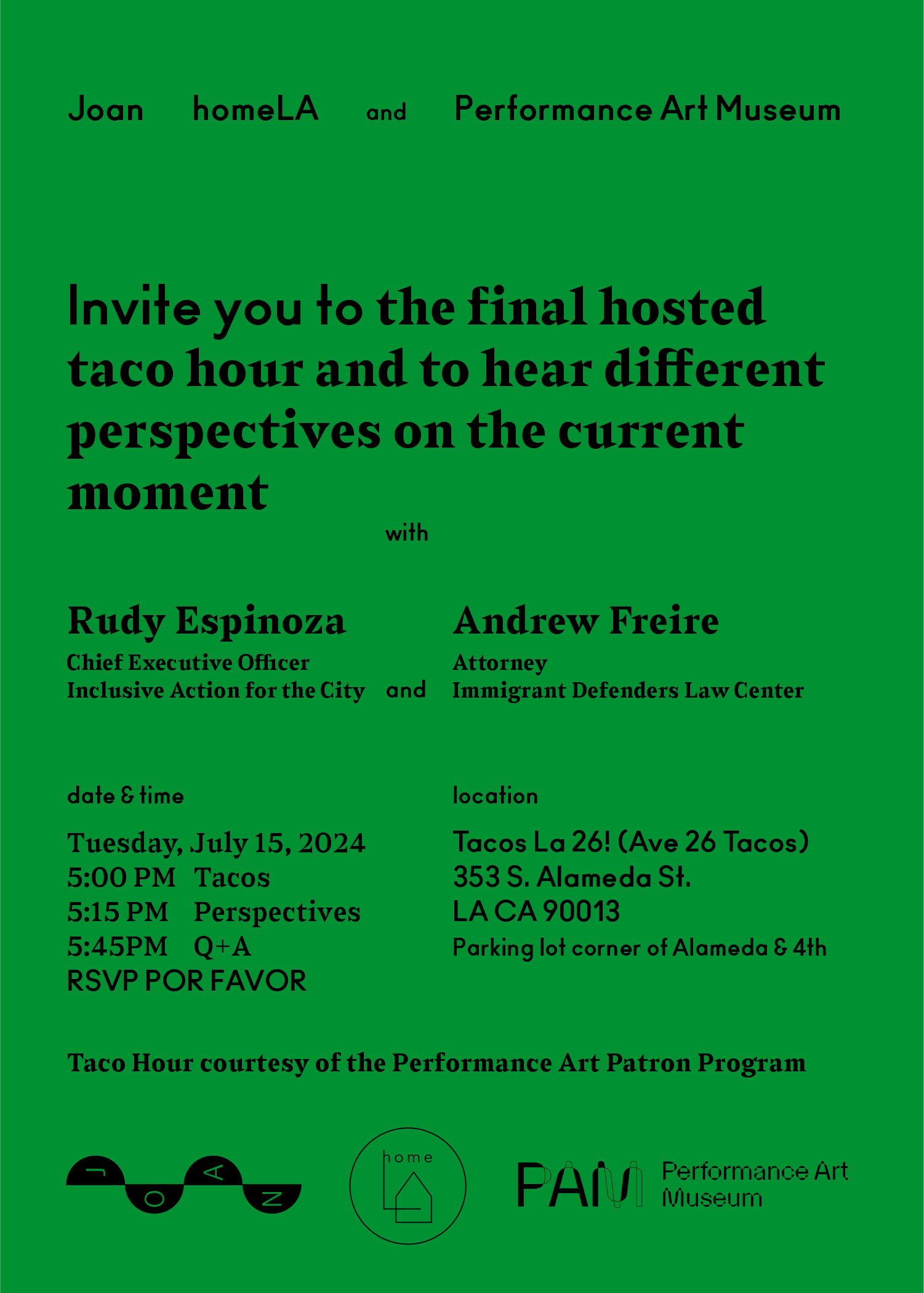 On July 15th, homeLA partnered with Performance Art Museum and JOAN to support Taco Hour - a series of events that featured free tacos from street vendors and conversations with invited guests about the ICE Raids in Los Angeles.